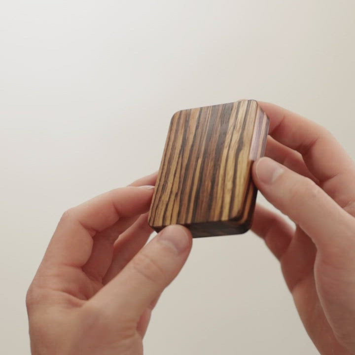 Each engagement ring box starts as a solid piece of seasoned timber. We carefully select the finest African Zebrano for colour and grain. The timber is then cut (bookmatched) in our Sydney workshop to ensure the timber remains strong and stable.